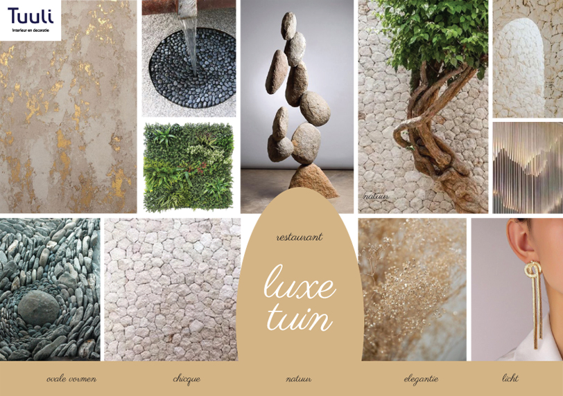 Luxury restaurant in a big city. A luxurious garden immediately came to my mind, a place where nature meets exquisite elegance: stones and gold, the relaxing sound of a stream,